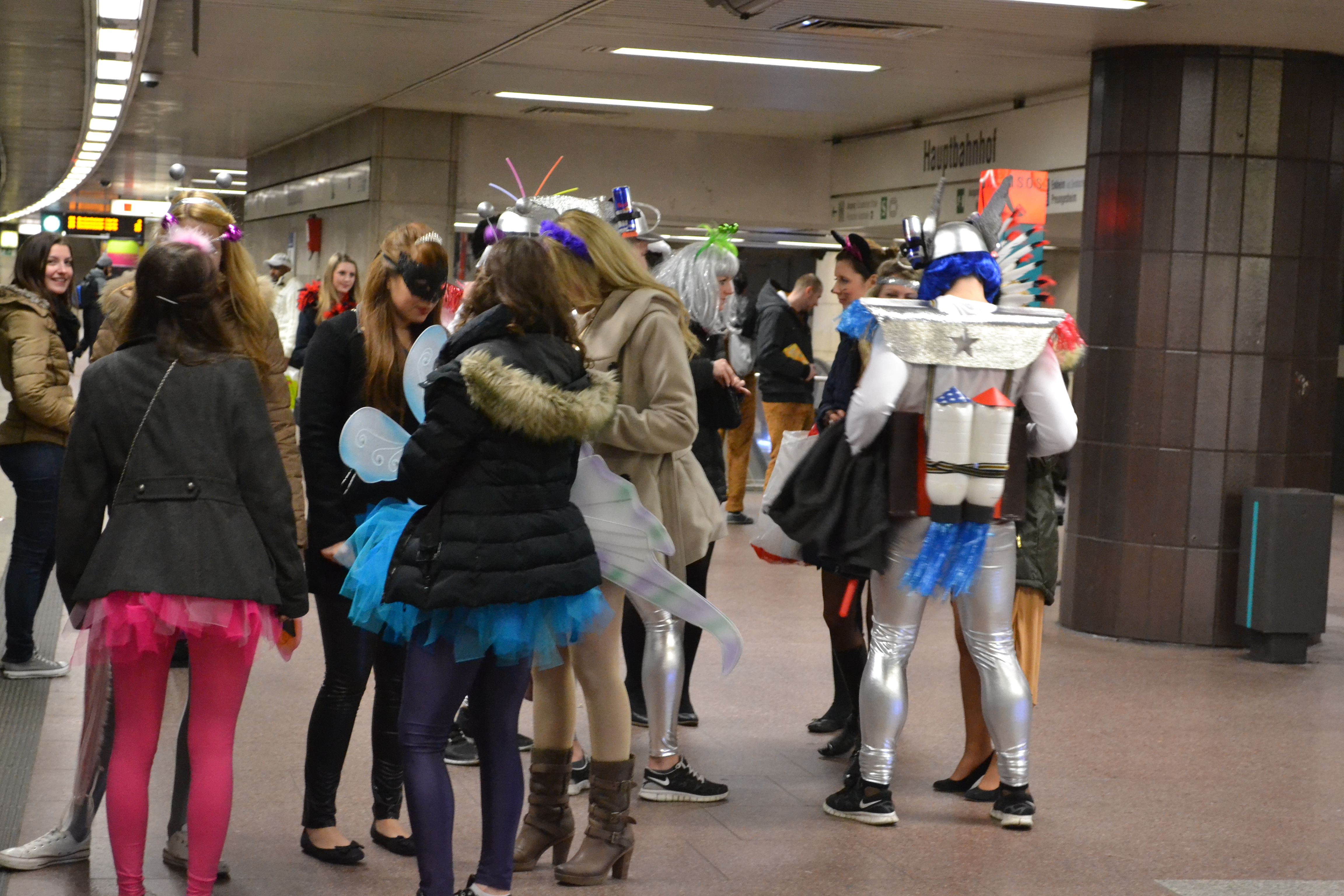 A group of young people waiting for the metro that will take them safely and reliably to their party.